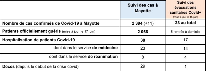 L'ARS de Mayotte annonce, ce vendredi 19 juin 2020, 11 nouveaux cas de Covid-19, ce qui fait monter le bilan total sur l'île à 2.394 cas confirmés depuis le début de l'épidémie. L'ARS informe également que 2.066 personnes sont guéries. Le bilan de patients décédés se porte toujours à 28 morts, plus le décès d'un patient mahorais au CHU de La Réunion, le 20 mai dernier. Par ailleurs, 38 patients sont hospitalisés dont 8 en service de réanimation. Nous publions le communiqué de l'ARS avec des informations à destination des voyageurs ci-dessous. (Photo d'illustration rb/www.ipreunion.com)
