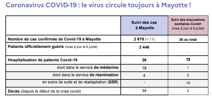 L'ARS de Mayotte annonce 11 nouveaux cas de Covid-19, ces dernières 24 heures. Le nombre total de cas positifs s'élève désormais à 2.679 personnes. En tout, 26 personnes sont hospitalisées dont 4 en réanimation. L'île aux parfums déplore toujours 34 décès depuis le début de l'épidémie. Deux Mahorais sont décédés à La Réunion suite à des évacuations sanitaires. L'ARS de Mayotte indique par ailleurs que 2.446 patients sont officiellement guéris. (Photo d'illustration rb/www.ipreunion.com)