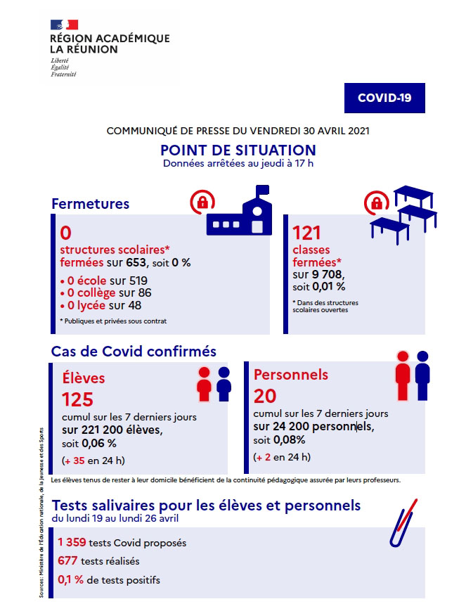 Du lundi 26 avril au jeudi 29 avril 2021, 125 élèves et 20 personnels ont été contaminés au Covid-19. 121 classes ont fermé cette semaine. Tous les établissements de l'île sont actuellement ouverts. 1.359 tests salivaires ont été réalisés au cours de la période. 0,1% d'entre-eux étaient % sont revenus positifs (Photo d'illustration rb/www.ipreunion.com)