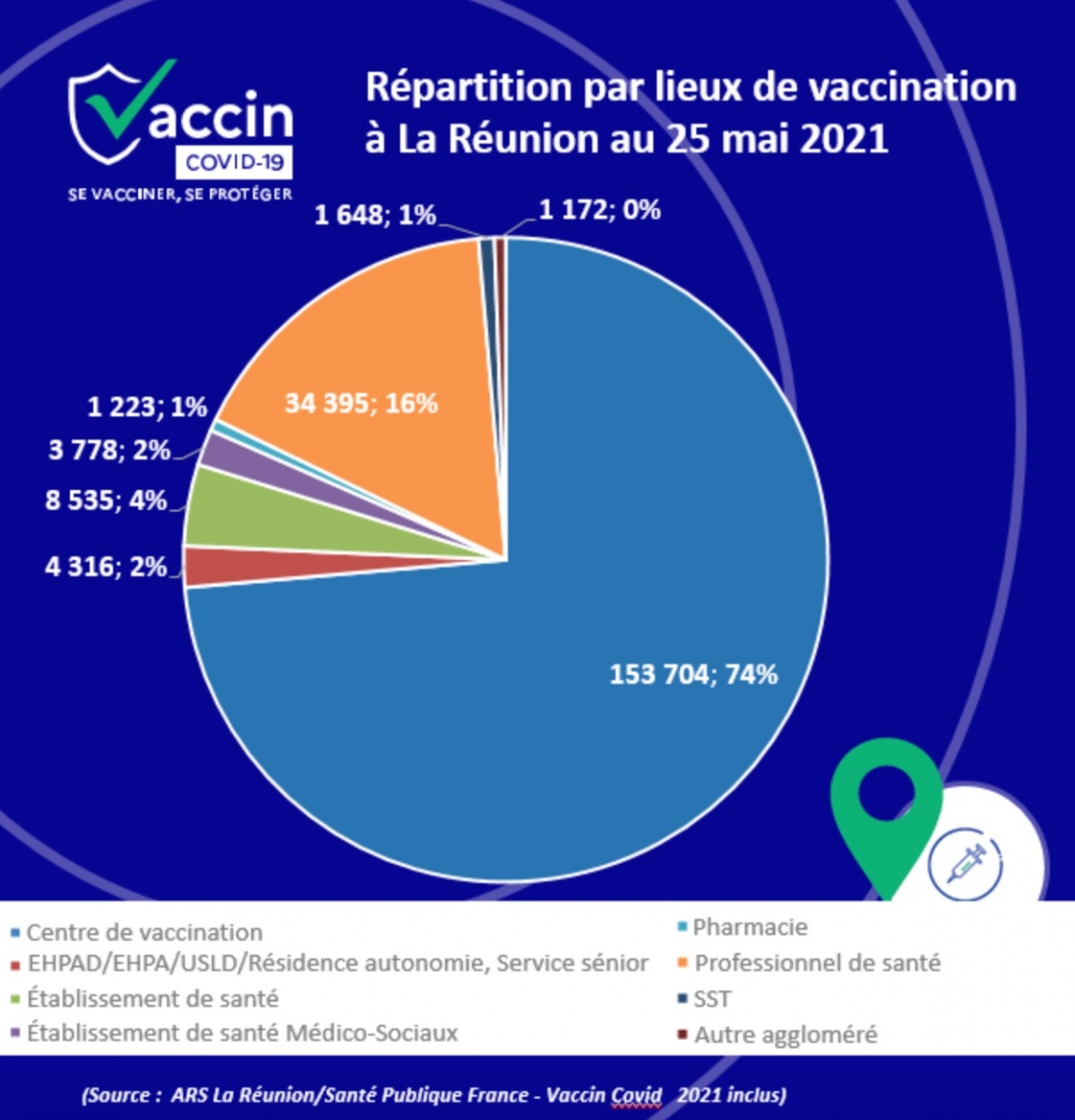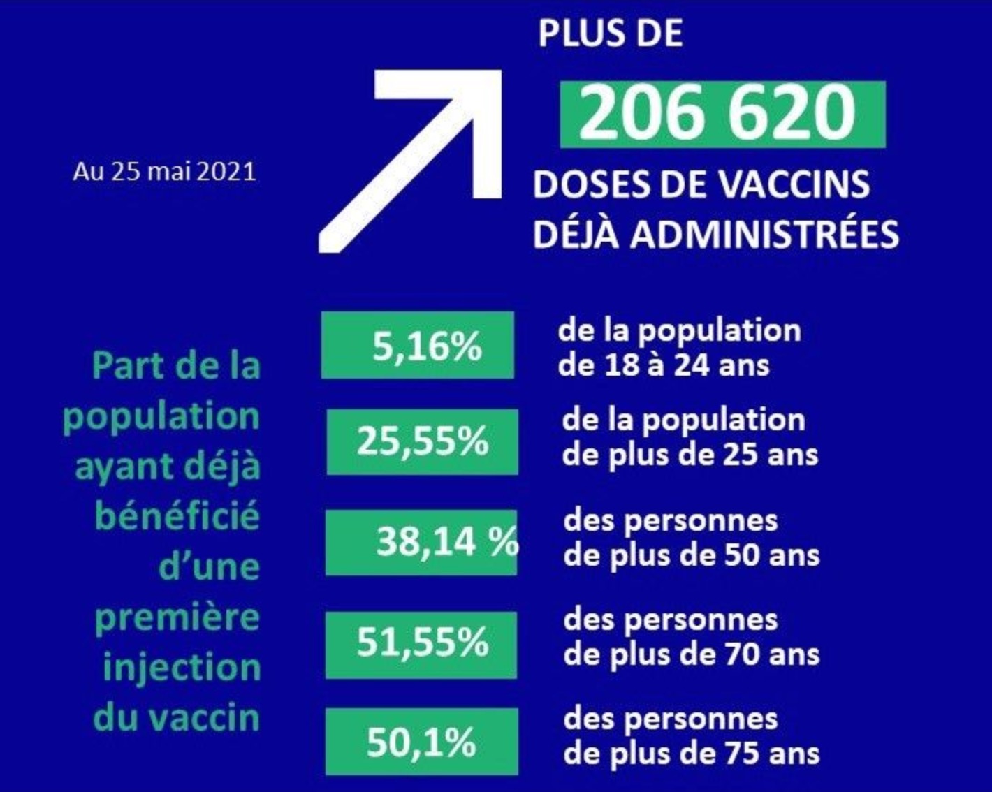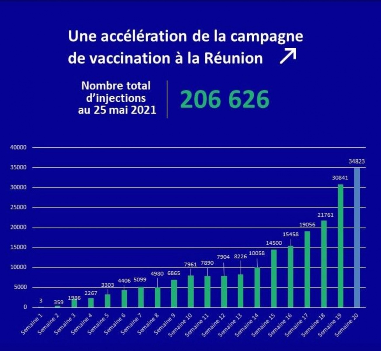 Au 25 mai 2021, 142.200 réunionnais avaient pu bénéficier d’au moins une première injection, dont 64.300 d’une deuxième injection. 17% de la population de La Réunion est donc entrée dans le processus de vaccination.
