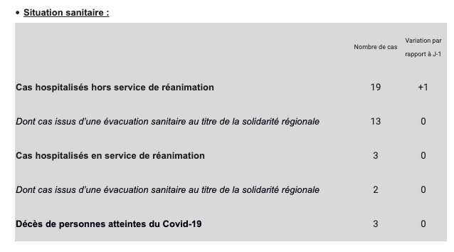 Ce dimanche 12 juillet 2020 a vu une nouvelle forte remontée dans les bilans quotidiens de la préfecture et de l'ARS : 16 nouveaux cas de Covid-19 sont confirmés. Si 2 de ces 16 nouveaux cas sont issus d'une évactuation sanitaire de Mayotte, 14 sont des cas importés dépistés à l'aéroport depuis vendredi.