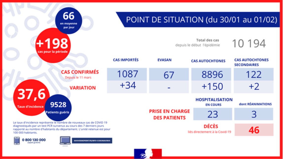 Les autorités sanitaires confirment 198 nouveaux cas de Covid-19 enregistrés à La Réunion du 30 janvier au 1er février 2021, soit une moyenne journalière de 66 cas sur trois jours consécutifs. 23 personnes sont hospitalisées dont 3 en réanimation. La hausse des cas se confirme sur l'île. La barre des 10.000 cas cumulés est donc franchie avec 10 .194 cas depuis l'apparition du premier cas le 11 mars 2020. Le taux d'incidence est toujours de 37,6. Nous publions ici le bilan des autorités (Photo rb/www.ipreunion.com)