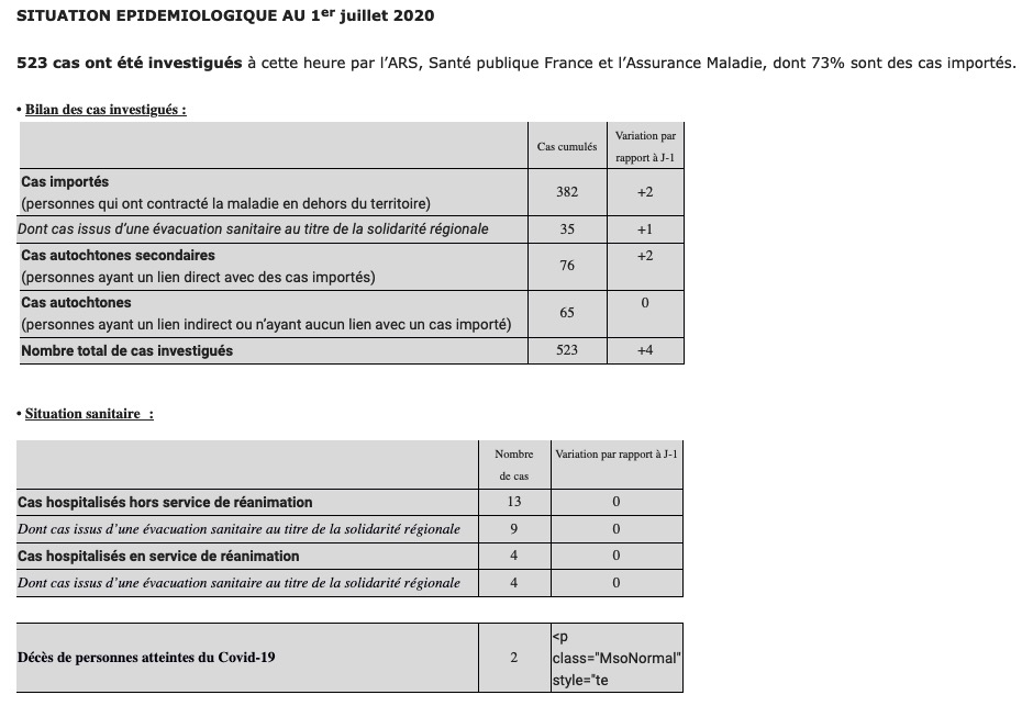 La préfecture et l'Agence Régionale de Santé confirment 2 nouveaux cas de coronavirus COVID-19 enregistrés à La Réunion ce mercredi 1er juillet à 15h00, soit un total de 528 cas depuis l'apparition du premier cas le 11 mars 2020. Parmi ces nouveaux cas, le premier est un cas importé dépisté à l'issue de la septaine, et le second est une évacuation sanitaire au titre de la solidarité régionale. Par ailleurs, 2 cas précédemment en cours d'investigation sont classés cas autochtones secondaires. Nous publions ici le communiqué de la préfecture et de l'ARS. (Photo d'illustration rb/www.ipreunion.com)