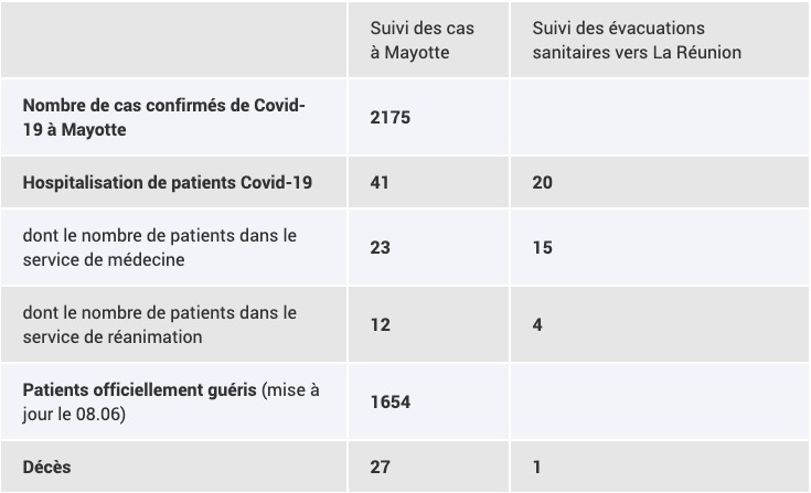 Un nouveau décès est à déplorer, portant à 28 (27 à Mayotte, 1 après évacuation vers La Réunion) le nombre total de décès depuis le début de l’épidémie. Il s’agit d’une personne âgée de 87 ans, décédée au CHM.