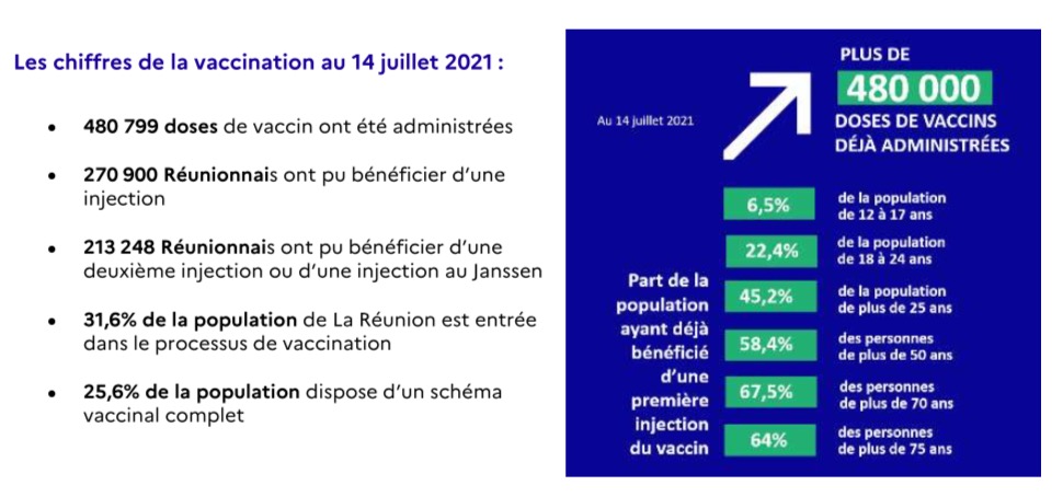 La couverture vaccinale à La Réunion reste insuffisante, en particulier chez les personnes les plus exposées aux formes graves de la maladie, et notamment chez les personnes âgées (67% des Réunionnais de plus de 70 ans ont reçu une première injection et 59% ont un schéma vaccinal complet, contre respectivement 86% et 81% en métropole).
