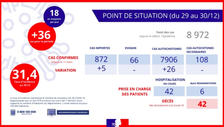 La Préfecture et l'Agence Régionale de Santé confirment 36 nouveaux cas de coronavirus covid-19 enregistrés à La Réunion du 29 au 30 décembre 2020 à 12h00 (soit une moyenne journalière de 18 cas sur 2 jours consécutifs). On enregistre un total de 8 972 cas depuis l’apparition du premier cas le 11 mars 2020.