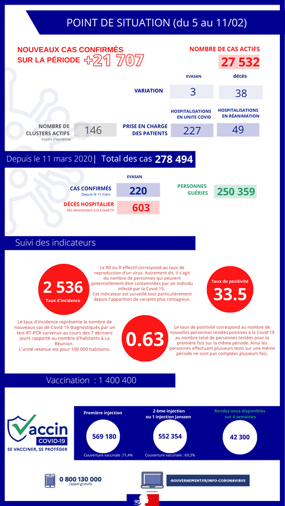 Le taux d’incidence hebdomadaire est en baisse à 2 536/100 000 habitants (contre 3 596 la semaine précédente). 21 707 cas ont été confirmés du 5 au 11 février. Compte tenu des 250 359 guérisons et des 603 décès depuis le début de la crise sanitaire, 27 532 cas sont encore actifs à ce jour. 278 494 cas ont été investigués à ce jour par l’ARS, Santé publique France et l’Assurance Maladie depuis le début de l’épidémie.