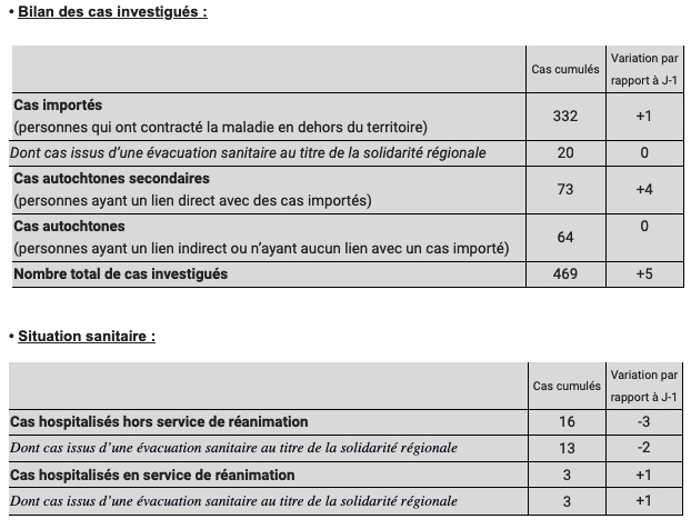 Par ailleurs, compte tenu des 411 guérisons prononcées, 59 infections au coronavirus COVID-19 sont encore en cours à ce jour. 469 cas ont été investigués à cette heure par l’ARS, Santé publique France et l’Assurance Maladie, dont 71% sont des cas importés.