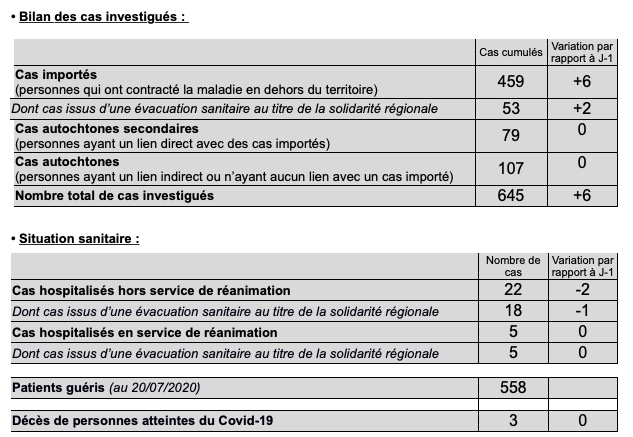 La préfecture et l'Agence Régionale de Santé confirment 6 nouveaux cas de coronavirus COVID-19 enregistrés à La Réunion ce mercredi 22 juillet à 15h00, soit un total de 645 cas depuis l'apparition du premier cas le 11 mars 2020. Parmi les nouveaux cas annoncés ce jour : 4 sont classés importés, suite à un dépistage réalisé 7 jours après leur arrivée à La Réunion, 2 sont issus d'une évacuation sanitaire au titre de la solidarité régionale.
