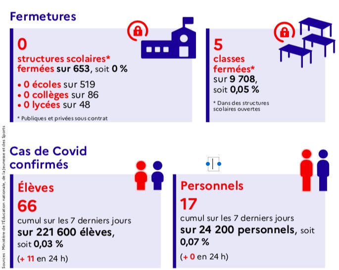 Sur les sept derniers jours, 66 élèves, dont 10 sur les dernières 24 heures, et 17 personnels testés positifs ces sept derniers jours à La Réunion, annonce le rectorat ce vendredi 2 octobre 2020. Actuellement, aucun établissement n'est fermé sur les 653 structures scolaires présentes dans l'île. 5 classes sur 9.708 sont fermées, soit 0,05% des classes. "Grâce au respect des règles sanitaires par les personnels et les élèves, l'impact du Covid en milieu scolaire reste maîtrisé en milieu scolaire" affirme le rectorat.