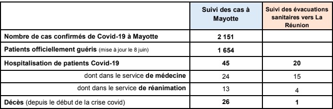 L'ARS de Mayotte annonce 72 nouveaux cas de Covid-19, ce qui fait monter le bilan total sur l'île à 2.151 cas confirmés depuis le début de l'épidémie. L'ARS informe également que 1.654 personnes sont guéries. Une nouvelle personne est décédée du virus, à l'âge de 95 ans. Le bilan se porte désormais à 26 morts. Par ailleurs, 45 patients sont hospitalisés dont 12 en service de réanimation. A noter enfin le nombre d'évacuations sanitaires vers La Réunion : 20 en tout, et le décès d'un patient mahorais qui a succombé au virus alors qu'il venait d'arriver au CHU Félix Guyon. Nous publions le communiqué ci-dessous. (Photo d'illustration rb/www.ipreunion.com)