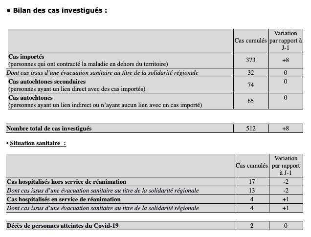 - 2 avaient réalisé un test préalable à leur embarquement dont le résultat était négatif, conformément au protocole sanitaire expérimental mis en place par le Ministère des Solidarités et de la Santé et le Ministère des Outre-mer ; le test réalisé à 7 jours après leur arrivée, au terme de la septaine, s’est révélé positif ;