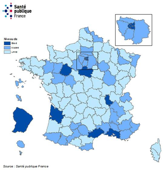 • modérée : Alpes-Maritimes, Alpes de Haute Provence, Aube, Bas-Rhin, Côte d’Or, Drôme, Essonne, Gard, Haute-Garonne, Haute-Savoie, Hautes Pyrénées, Ille-et-Vilaine, Isère, Eure-et-Loir, Indre et Loire, Mayenne, Mayotte, Meurthe et Moselle, Nord, Oise, Pyrénées Atlantique, Pyrénées Orientales, Réunion, Maine-et-Loire, Martinique, Guadeloupe et Saint Martin, Seine et Marne, Tarn, Tarn-et-Garonne, Val d’Oise, Var, Vaucluse, Yvelines