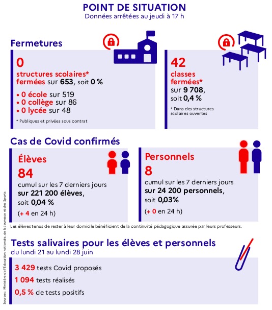 Cette semaine, 84 élèves et 8 personnels ont été testés positifs. Si aucun établissement n'a été fermé, 42 classes ont fermé leurs portes après la détection de cas de Covid-19 chez des élèves. Sur 1.094 tests salivaires réalisés, 0,5 % étaient positifs (Photo d'illustration rb/www.ipreunion.com)