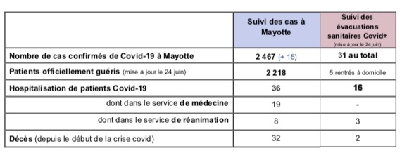 Deux nouveaux décès sont à déplorer : une personne âgée de 51 ans hospitalisée au CHM en réanimation depuis début juin, et un jeune patient de 18 ans évacué récemment au CHU de La Réunion suite à une affection de longue durée. Le nombre total de décès liés au coronavirus à Mayotte se porte donc à 34 à présent.