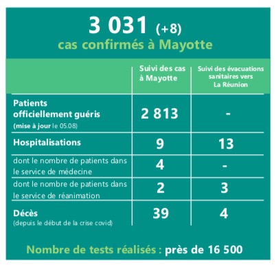 Ce mercredi 5 août 2020, l'Agence régionale de Santé (ARS) de Mayotte confirme huit nouveaux cas de Covid-19. Neuf personnes sont toujours hospitalisées, dont deux en réanimation. Une femme mahoraise est par ailleurs décédée à La Réunion suite à une évacuation sanitaire. Elle souffrait d'une autre pathologie grave. (Photo d'illustration rb/www.ipreunion.com)
