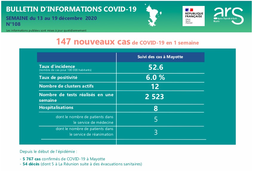 Un décès et 147 cas de Covid-19 ont été confirmés en une semaine à Mayotte, ce mercredi 23 décembre 2020. Le taux d'incidence est actuellement de 52,6 pour 100.000 habitants, douze foyers de contagion sont actifs. Nous publions le communiqué ci-dessous. (Photo d'illustration rb/www.ipreunion.com)