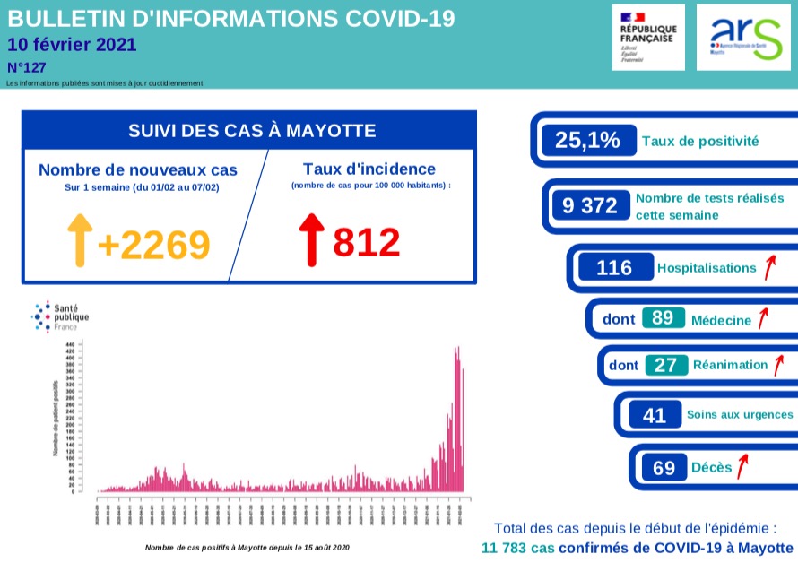 La situation se dégrade toujours plus à Mayotte : un nouveau décès lié au Covid-19 est à déplorer ce mercredi 10 février 2021. Il s'agit d'une personne âgée de 83 ans, qui était en soins aux urgences. 69 personnes sont mortes au total depuis le début de l'épidémie. 2.269 nouveaux cas ont par ailleurs été confirmés en une semaine, soit 9.372 depuis l'apparition du premier cas de Covid-19 à Mayotte. 112 personnes sont actuellement hospitalisées, dont 27 en réanimation, tandis que les évacuations sanitaires vers La Réunion continuent (Photo d'illustration rb/www.ipreunion.com)
