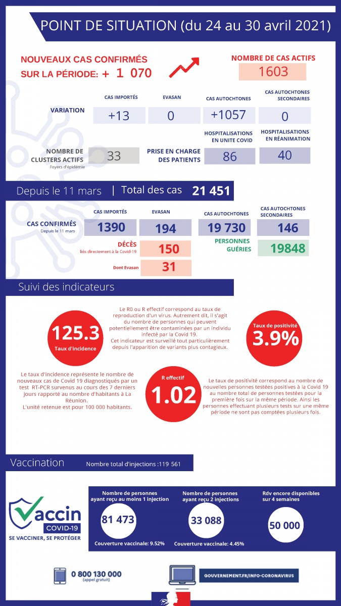 Deux personnes âgées de plus de 55 ans sont mortes des suites du Covid-19 au cours de la semaine de 24 avril au 30 avril 2021, annoncent les autorités sanitaires ce mardi 4 mai. 1 070 nouveaux cas ont été également été recensés au cours de même période. Ces chiffres portent le taux d'incidence (nombre de personnes contaminées) à 125,3. Cet indicateur augmente par rapport à la semaine précédente où il à 121,6. Pour rappel, à La Réunion depuis le début de l'épidémie le 11 mars 2020, 150 malades sont décédés des suites de la maladie. 80 de ces personnes sont décédées au cours des sept dernières semaines. Nous publions ci-dessous le communiqué des autorités sanitaires (Photo rb/www.ipreunion.com)