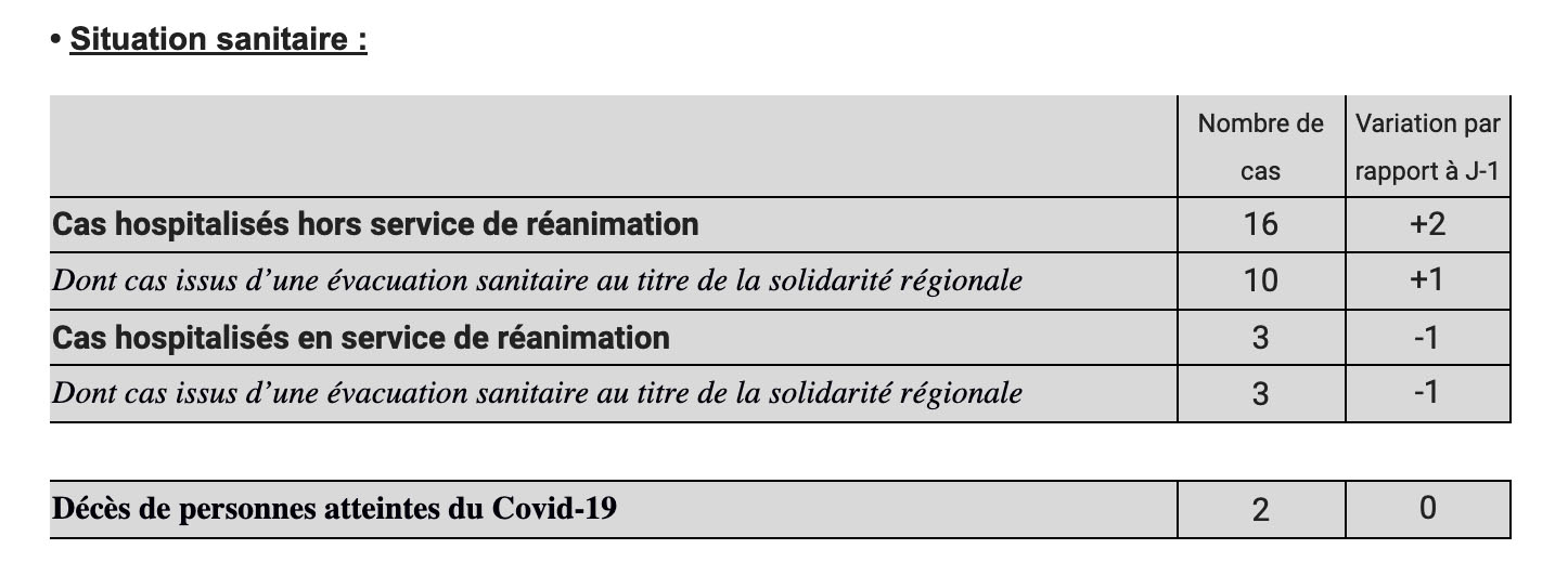 Deux nouveaux cas de coronavirus ont été enregistrés par les autorités sanitaires ce vendredi 3 juillet 2020. Il s'agit "de cas importés : un a été dépisté à l'issue de sa septaine et le deuxième a été testé à son arrivée à l'aéroport" précise la préfecture. Au total, depuis l'apparition du premier cas le 11 mars dernier, 533 patients ont été recensés. "385 sont des cas importés, 76 sont des cas autochtones secondaires (personnes ayant un lien direct avec des cas importés) et 70 sont des cas autochones (personnes ayant un lien indirect ou n'ayant aucun lien avec un cas importé)" précise l'Agence régionale de santé. Depuis le début de l'épidémie les cas importés constituent donc la part la plus important du bilan. Un état de fait faisant craindre une possible augmentation des cas dès le 10 juillet date de la fin de la septaine obligatoire