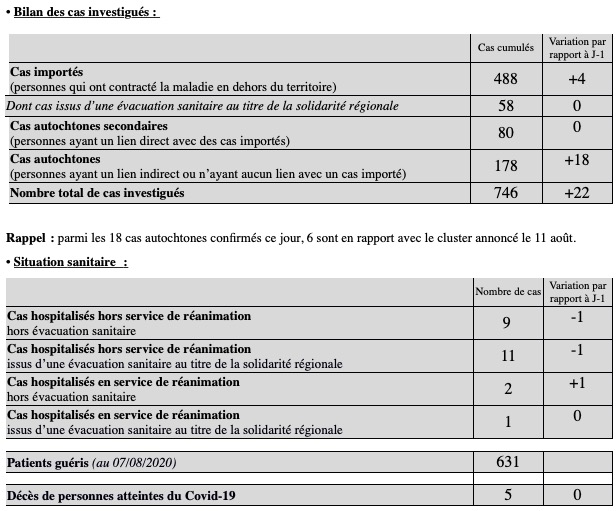 - 5 cas sont classés autochtones sans lien avec le Cluster annoncé le 11 août ;
