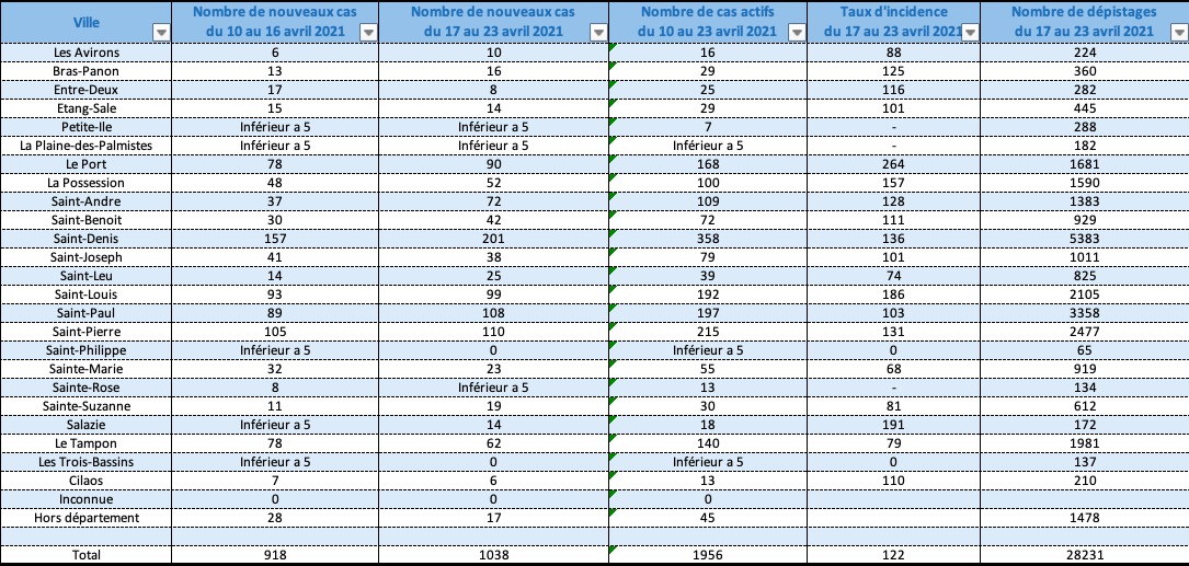 Le Port enregistre le plus haut taux d'incidence de l'île avec 268 pour 100.000 habitants. Il est suivi par Salazie, qui enregistre un taux de 191 pour 100.000 habitants, puis de Saint-Louis, qui culmine à 186. Le taux d'incidence entre le 17 et 23 avril 2021 est de 121,6 pour toute La Réunion. Seules sept communes, Trois-Bassins, Sainte-Marie, Saint-Leu, Le Tampon, Sainte-Suzanne, les Avirons et Saint-Philippe se trouvent en-dessous du seuil de vigilance, qui est de 100 pour 100.000 habitants. (Photo d'illustration rb/www.ipreunion.com)