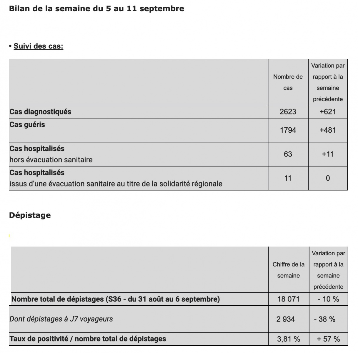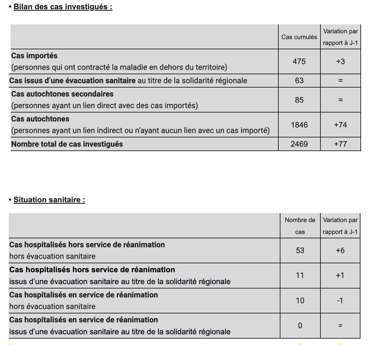 Au total 2 623 cas ont été diagnostiqués sur le territoire depuis l’apparition du premier cas le 11 mars 2020, dont 63 évacuations sanitaires au titre de la solidarité régionale depuis cette date.