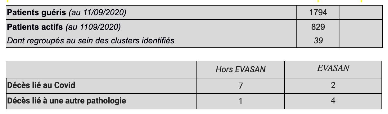 A ce jour, 829 cas de coronavirus COVID 19 sont actifs. Parmi ces cas, 10 sont hospitalisés en service de réanimation et 64 hors service de réanimation.