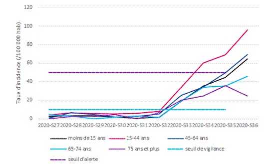 En semaine 36, le taux de positivité était en hausse par rapport à la semaine précédente et s’établissait à 3.81 %, tout en restant inférieur au seuil de vigilance (5%).