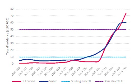 A La Réunion, du 30 août au 5 septembre 2020, le R est estimé à 1,29.