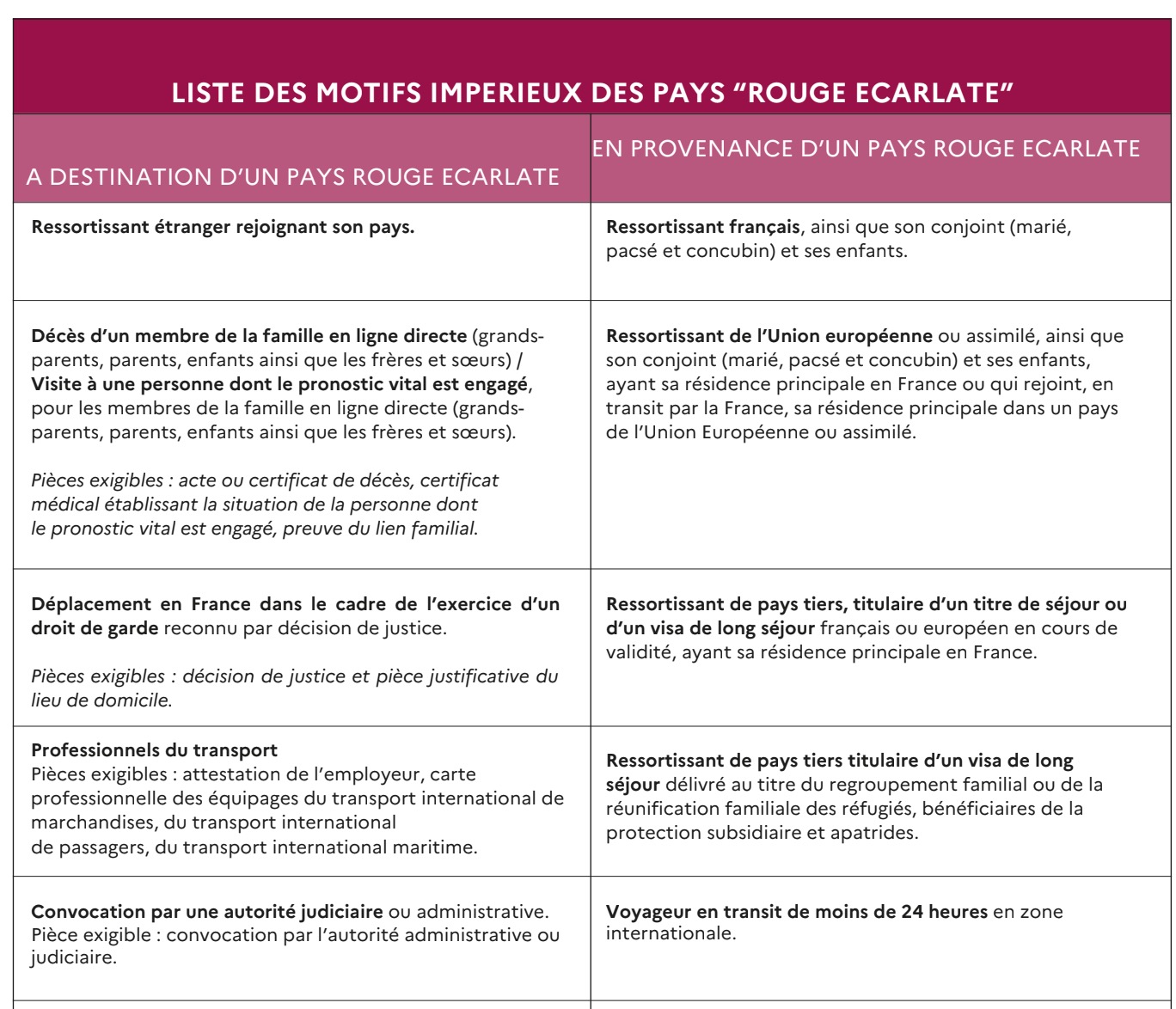A compter du samedi 4 décembre 2021, seuls les passagers justifiant des motifs impérieux suivants pourront voyager en provenance et à destination des pays classés " rouge écarlate ". Les voyages à titre touristique ou étudiant ne sont plus autorisés. Cette mesure concerne tous les passagers, quel que soit leur statut vaccinal.