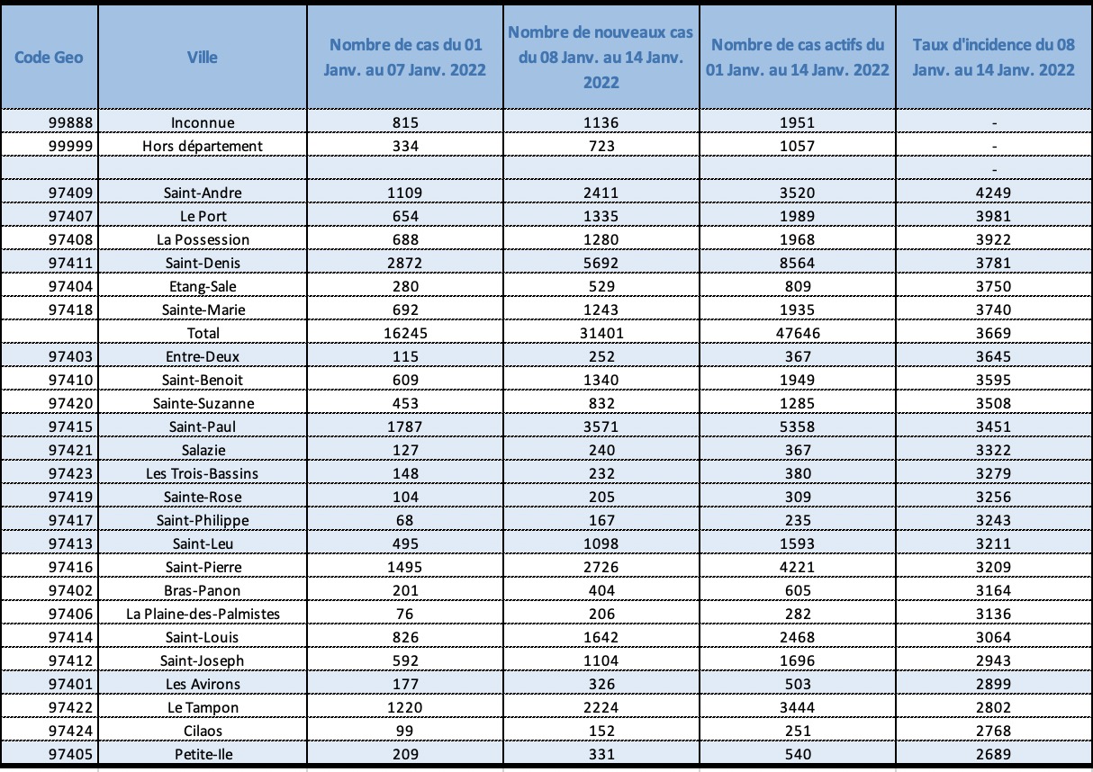 Le taux d'incidence continue de grimper en flèche à La Réunion. C'est la commune de Saint-André qui est la plus touchée, avec un taux qui atteint 4.249 cas pour 100.000 habitants du 8 au 14 janvier 2022. Le Port se place en deuxième position, avec 3.981 cas pour 100.000 habitants, suivi de La Possession qui enregistre 3.922 cas pour 100.000 habitants. Petite-Ile est la commune la moins touchée, mais son taux d'incidence reste extrêmement élevé, avec 2.689 cas pour 100.000 habitants. Ce mardi, le taux d'incidence de La Réunion culminait à 4.254 ce mardi (Photo photo RB imazpress)