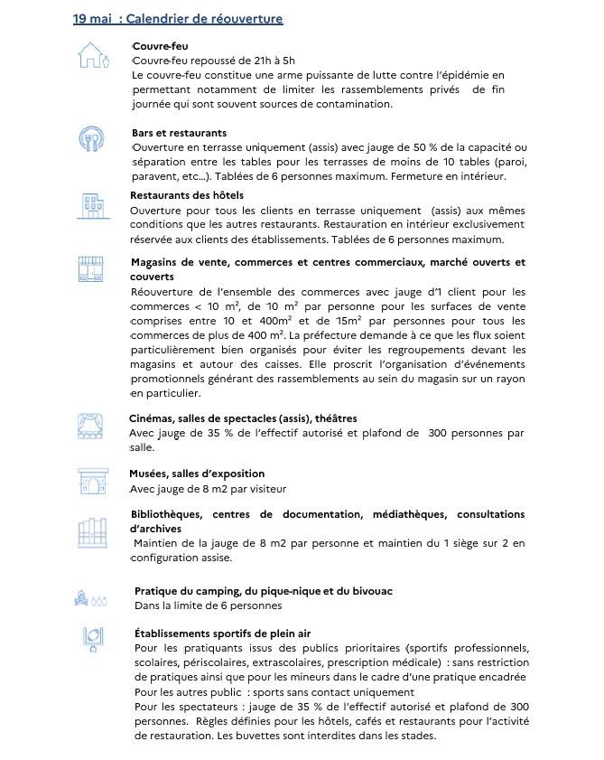 "Le 29 avril, je présentais aux Réunionnaises et aux Réunionnais la stratégie locale de levée des mesures de protection en lien avec les annonces du Président de la République. Cette feuille de route a fait l'objet d'une concertation locale avec la communauté médicale, les élus, les partenaires économiques et sociaux et l'ensemble des secteurs concernés. Quinze jours plus tard, nos indicateurs de suivi demeurent contrastés et m'incitent à la plus grande prudence. Nous allons donc enclencher cette 2eme étape mais en conservant certaines restrictions, adaptées à la typologie des clusters réunionnais. J'ai ainsi décidé par exemple de conserver l'interdiction des moments de convivialité en entreprise, de maintenir une jauge plus restrictive dans les magasins ou de fixer une limite maximale de 300 personnes à ne pas dépasser dans l'organisation des évènements" annonce-t-il.
