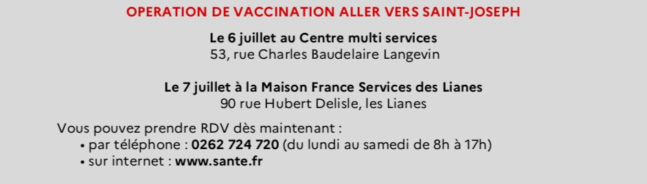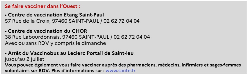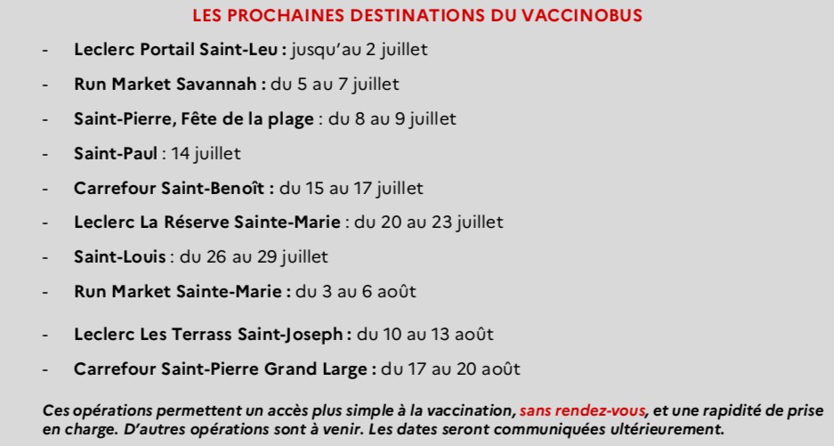 Dans le but de faciliter encore davantage l’accès à la vaccination aux Réunionnais, l’ARS, en lien avec les communes, les centres commerciaux et la Croix Rouge, met en place de nouvelles opérations de vaccination de proximité en juillet et août.