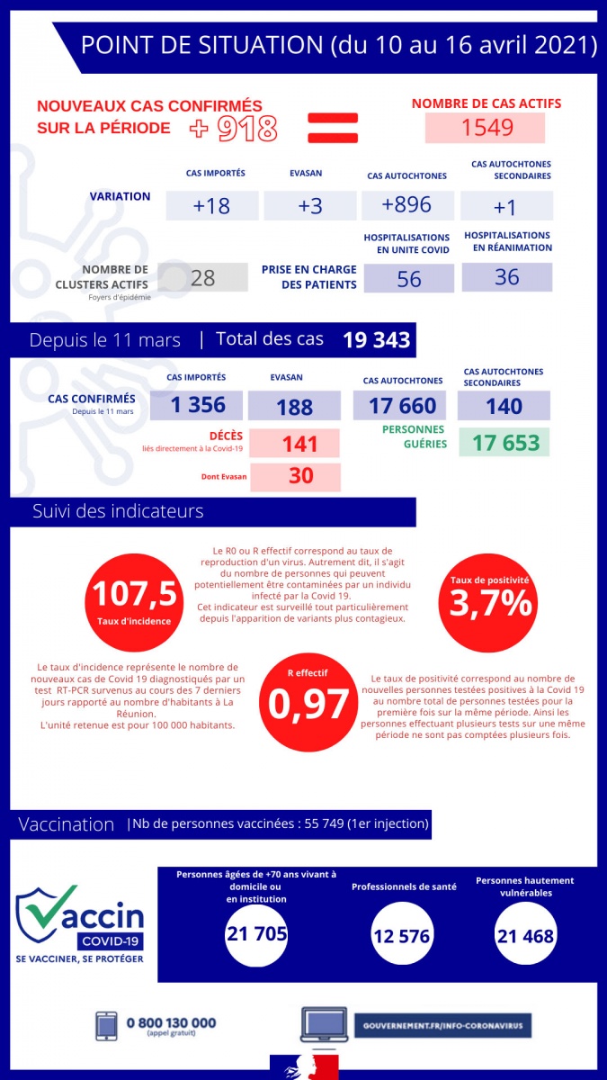 Du 10 avril au 16 avril, 1 303 tests ont été criblés pour identifier une souche de variante. Sur ces 1 303 tests, on comptabilise 961 cas de variantes Covid-19 (883 sud-africains ou brésiliens et 78 britanniques), soit une proportion de 74% contre 72,7% la semaine dernière. Compte tenu des 17 653 guérisons et des 141 décès depuis le début de la crise sanitaire, 1 549 cas sont encore actifs à ce jour.