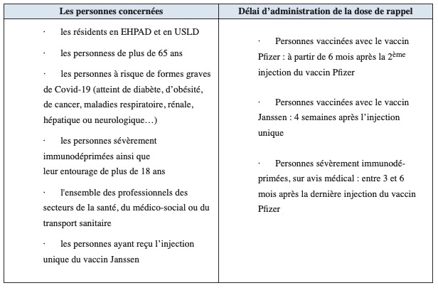 personnes vulnérables, professionnels de santé) dès le délai requis (à partir de 6