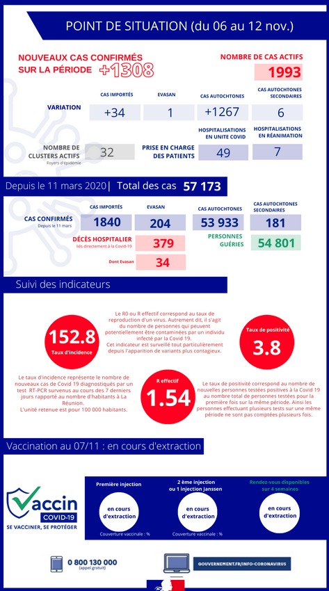 Du 6 au 12 novembre, 1 652 tests positifs ont été criblés pour identifier une mutation : 1 339 cas présentaient une des mutations spécifiques sous surveillance, soit une proportion de 81 %, en légère diminution par rapport à la semaine précédente. Le variant Delta (indien) représente plus de 99 % des mutations détectées.