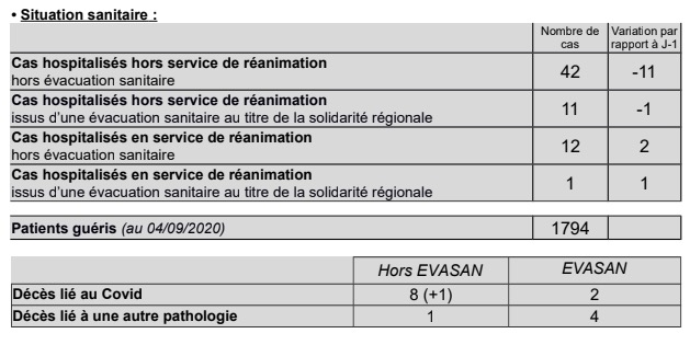 Chaque jour sa litanie de chiffres... Et malheureusement un décès de plus. la pandémie est clairement hors de contrÃ'le. L'ARS totalement invisible pendant plusieurs jours au moment des grands retours de vacances a laissé rentrer le virus et ne maîtrise plus rien. Plus personne ou presque ne leur fait vraiment confiance. Les soignants vont être de plus en plus sollicités, espérons qu'au moins ils auront et le matériel et le personnel nécessaires pour pouvoir gérer au mieux les hospitalisations.