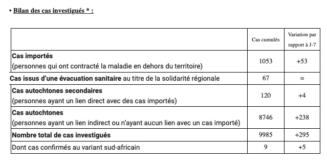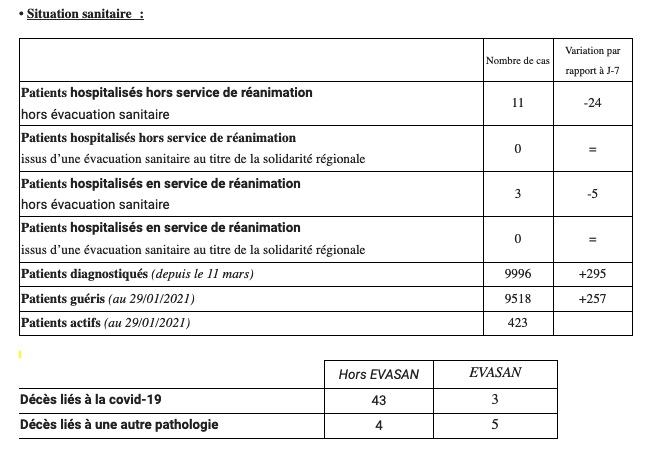 Au total, 9 996 cas ont été diagnostiqués sur le territoire depuis l’apparition du premier cas le 11 mars 2020, dont 67 évacuations sanitaires au titre de la solidarité régionale. Au 29 janvier 2021, compte tenu des 9 518 guérisons et des 55 décès, 423 cas sont encore actifs à ce jour. 9 985 cas ont été investigués à cette heure par l’ARS, Santé publique France et l’Assurance Maladie, dont 10% sont des cas importés.