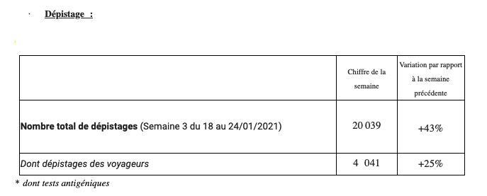 Durant la semaine du 18 janvier au 24 janvier (semaine 3), le nombre moyen de cas confirmés est de 46 cas par jour (à rapporter aux 25 cas en moyenne de la semaine 2 et aux 36 cas en moyenne de la semaine 1). Le taux d’incidence est de 37,6/100 000 habitants. Il reste à ce stade en dessous du " seuil national d’alerte " (50/100 000). Sur les 7 derniers jours, le nombre de cas diagnostiqués augmente : 295 cas.