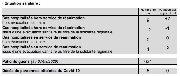 Ainsi, 12 nouveaux cas de Covid-19 ont été recensés ces dernières 24 heures, dont 6 cas autochtones. Les 3 cas en cours d'investigation déclarés hier ont également été classés autochtones, formant un cluster de 9 personnes ayant participé à un repas familial. La préfecture et l'ARS indiquent par ailleurs que près de 100 cas contacts sont en cours d'investigation. Nous publions leur nouveau point de situation épidémiologique ci-dessous.