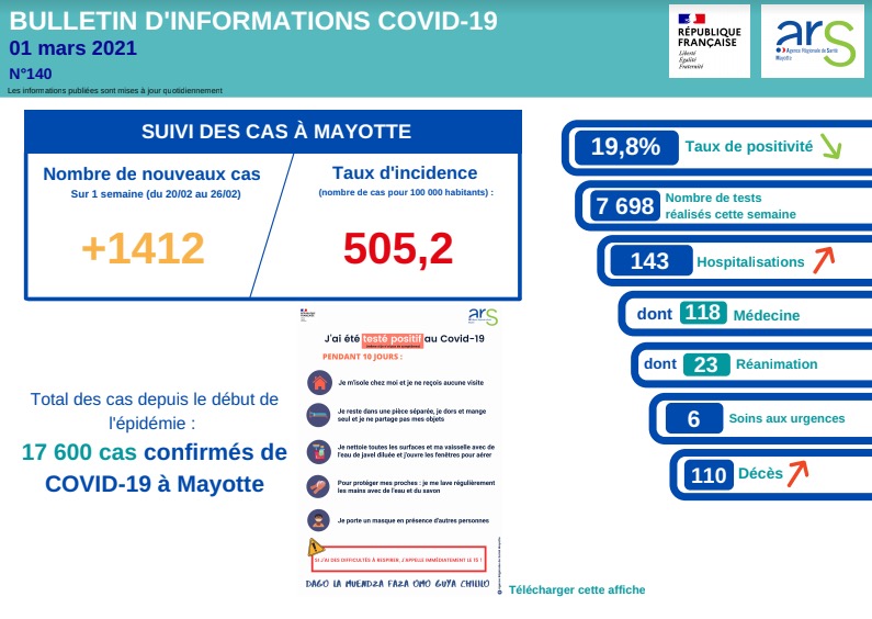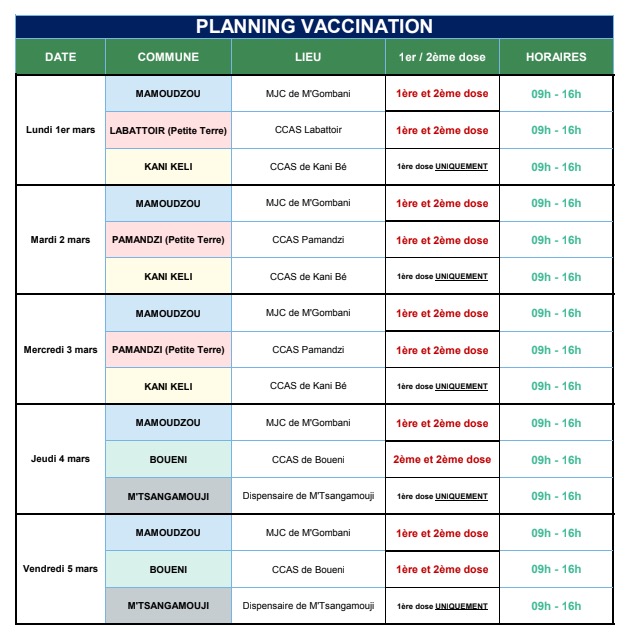 Un nouveau décès est à déplorer à Mayotte, portant à 110 le total de décès liés au coronavirus depuis le début de l'épidémie (dont 7 à La Réunion après évacuations sanitaires), indique l'agence régionale de santé de Mayotte. Il s'agit d'une personne âgée de 56 ans hospitalisée en médecine. Cette semaine, la campagne de vaccination se poursuit à Mamoudzou, Labattoir, Kani Kéli, M'tsangamouji et Bouéni, l'ARS publie le planning de vaccination. (Photo : ARS de Mayotte)