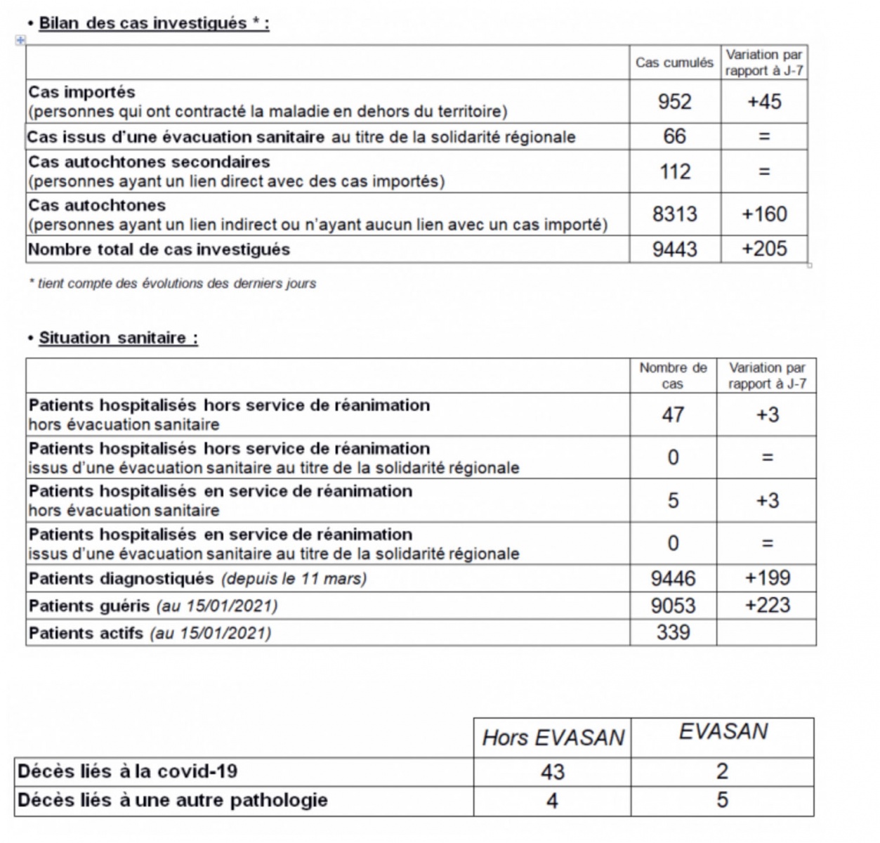 Au 15 janvier 2021, hors décès, compte tenu des 9 053 guérisons, 339 cas sont encore actifs à ce jour. 9 443 cas ont été investigués à cette heure par l’ARS, Santé publique France et l’Assurance Maladie.