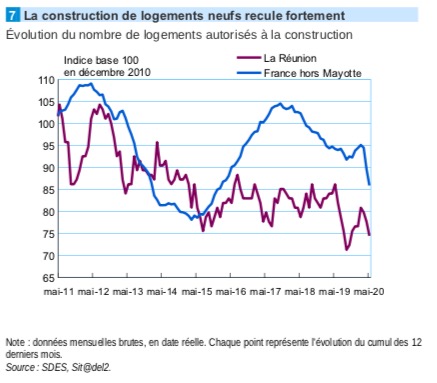 En un an, de juin 2019 à mai 2020, 7 000 logements ont été autorisés à la construction à La Réunion. C’est 14 % de moins qu’entre juin 2018 et mai 2019 (figure 7). En France hors Mayotte, les autorisations à la construction se replient aussi sur la période (- 9 %).