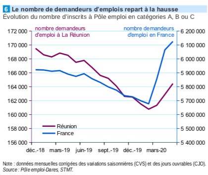 - Une hausse du nombre de demandeurs d’emplois massive, mais limitée par rapport à la métropole -