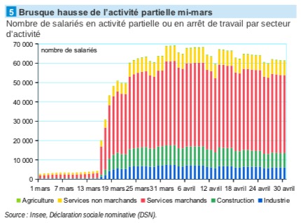 L’activité partielle concerne environ dix fois plus de salariés que les arrêts de travail pour cause de maladie ou de garde d’enfants. La part de l’activité partielle et des arrêts de travail dans l’emploi salarié a ainsi fluctué entre 35 % et 42 % de mi-mars à fin avril 2020. Avant la crise sanitaire, cette part se situait en deçà des 3 %.