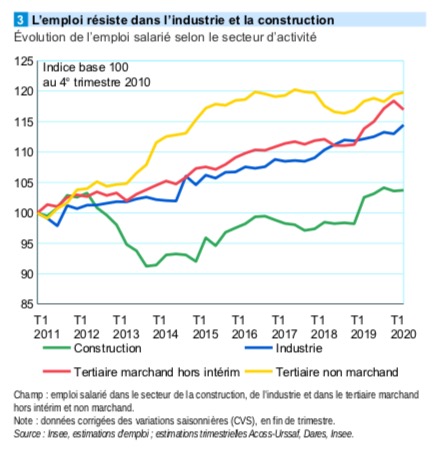 Dans ce dernier secteur, le nombre de déclarations préalables à l’embauche (DPAE) est ainsi en baisse sensible par rapport à un premier trimestre habituel (- 10 %). En revanche, dans la construction et l’industrie, l’emploi salarié résiste