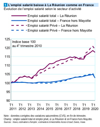 Depuis la mi-mars 2020, l'économie réunionnaise n'est pas épargnée par les conséquences de la crise sanitaire et le confinement mis en place pendant deux mois. La chute brutale de l'activité ne s'est pas immédiatement traduite par des destructions d'emplois dans les mêmes proportions, mais le marché du travail est durement touché. Le recours à l'activité partielle a été massif à La Réunion : jusqu'à 69 000 personnes, soit 42 % des salariés. Cela a permis, au moins pour le moment, de préserver la plupart des emplois.