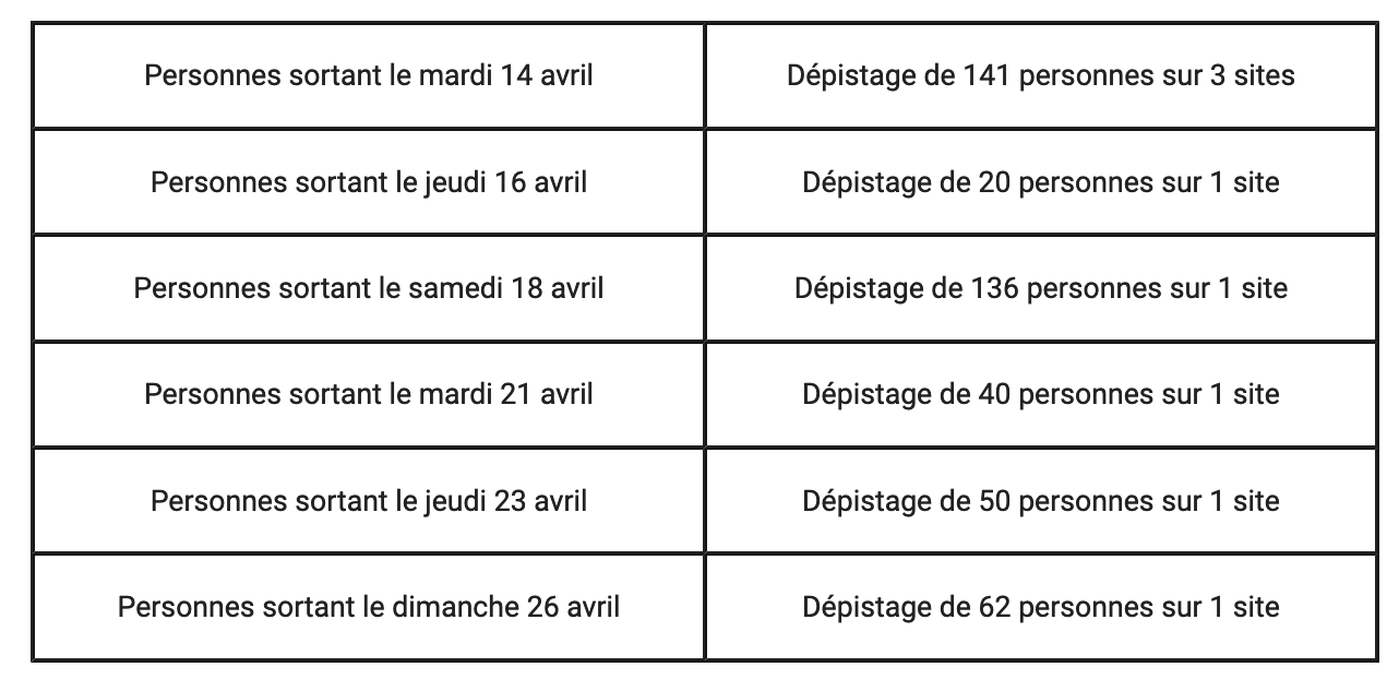 Pour les personnes placées en quatorzaine en centre dédié, le dépistage systématique sera organisé par l’Agence régionale de santé à travers la projection d’équipe mobile de prélèvement, cette équipe mobile pouvant être composée de praticiens du CHU ou de laboratoires privés. Cette campagne de dépistage sera réalisée le 12ème ou le 13ème jour de la quatorzaine, afin que les personnes puissent savoir, à l’issue de leur quatorzaine, si elles sont atteintes par le virus ou non.