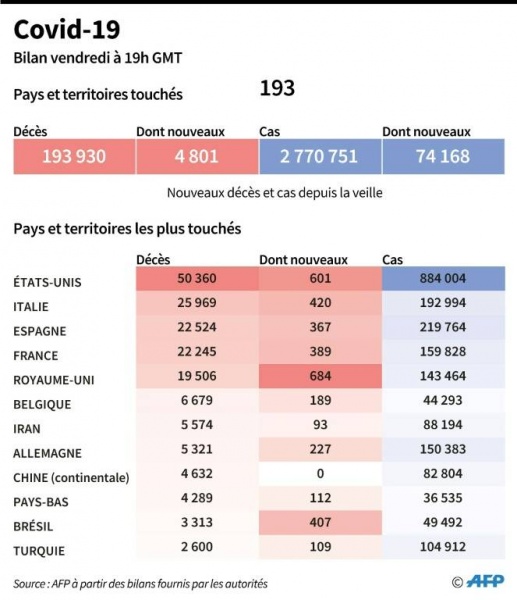 Aux Etats-Unis, dont l'économie souffre durement - comme beaucoup d'autres - des restrictions imposées par l'épidémie, Donald Trump a promulgué un nouveau plan d'aide de près de 500 milliards de dollars, pour soulager les entreprises et les hôpitaux. Il y a urgence: le PIB (produit intérieur brut) américain devrait plonger de 12% ce trimestre et le taux de chômage grimper à 14%.